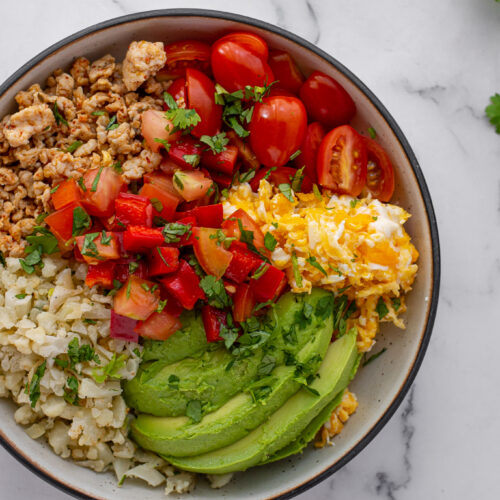 - To assemble add 1 cup of cauliflower rice, 1 cup of ground chicken, 1 scrambled or sunny side egg, 1/4 cup of cherry tomatoes, 1/2 sliced avocado, 1/4 cup of pico de gallo, and cilantro for garnish. Enjoy!