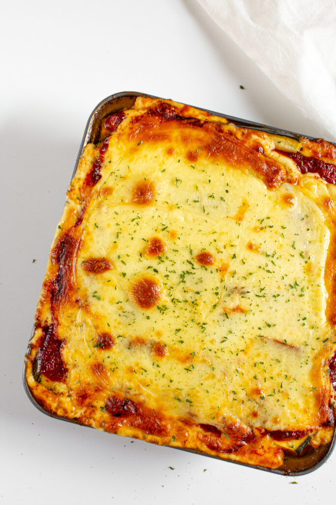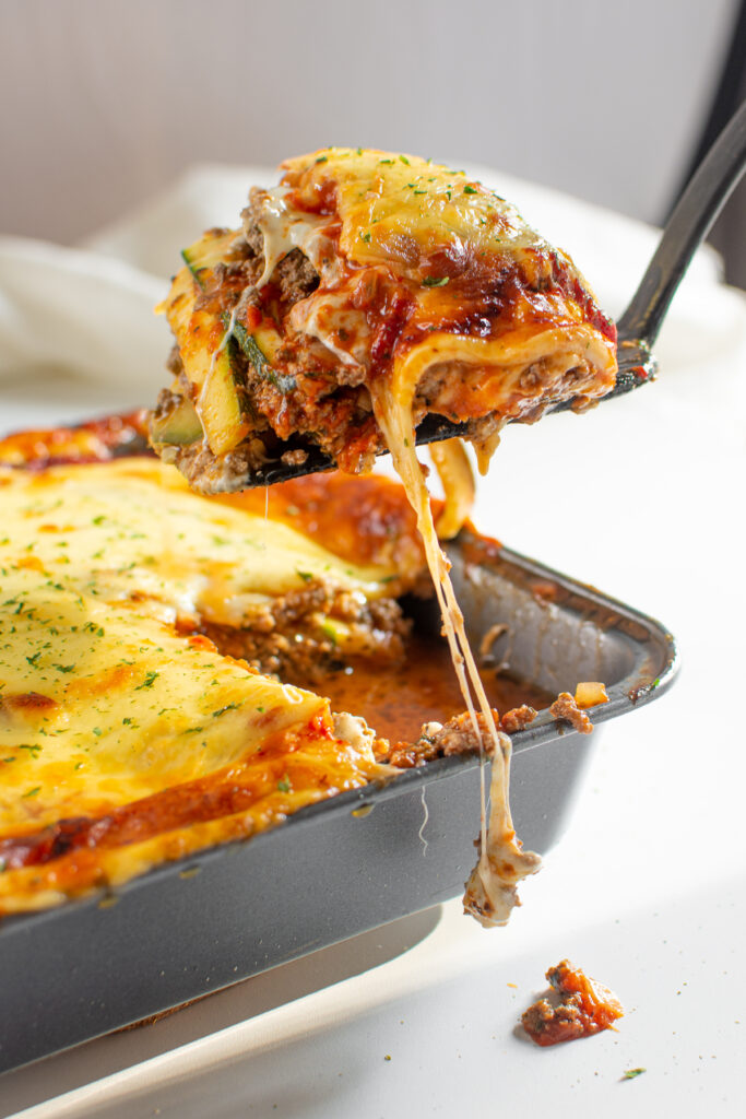 Esta receta usa fideos de calabacín en vez de las láminas para lasaña regular de pasta haciéndola perfectamente libre de gluten y basada en ingredientes keto, pero sigue tan satisfactoria y llena tanto como la lasaña clásica.