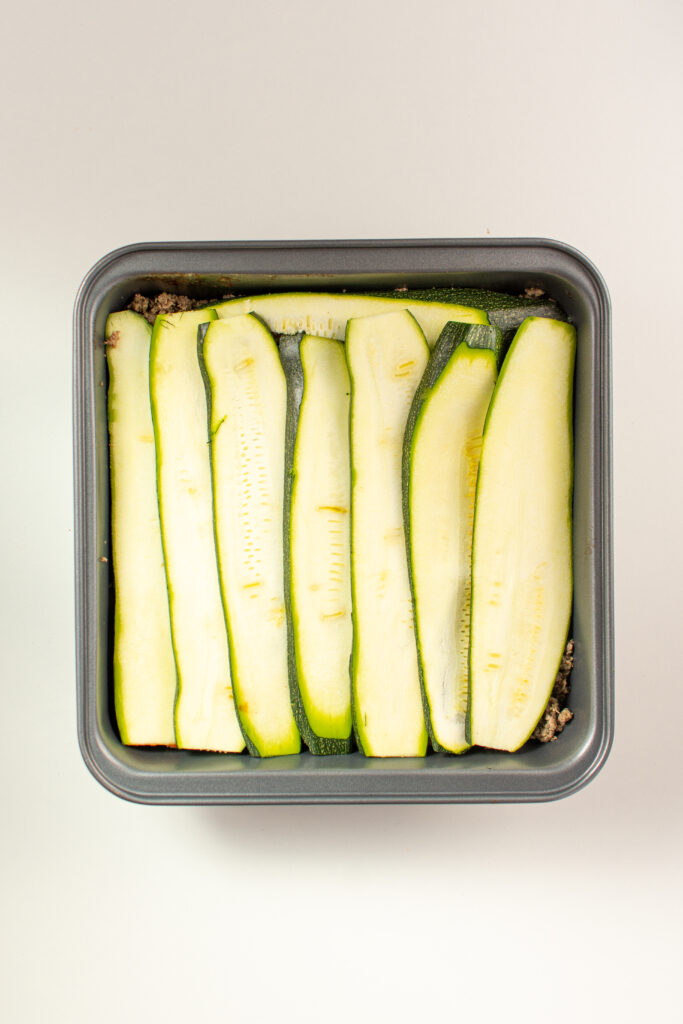 - Para el montaje, corte los calabacines en rodajas finas a lo largo (alrededor de 1/8 de pulgada). Agregue 3 cucharadas de salsa al fondo de su molde para hornear (usé un molde de 8x8 pulgadas) y extiéndalo para cubrir la superficie. Agregue una capa de rodajas de calabacín superpuestas, queso, carne y repita hasta que se agoten los ingredientes.