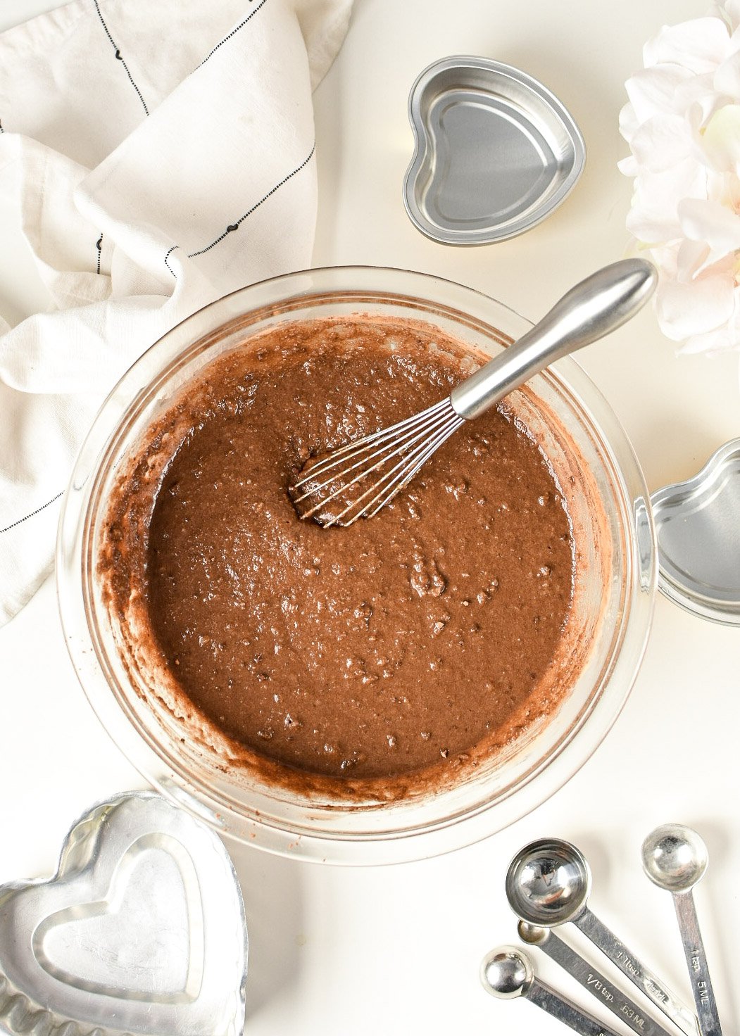 • Agrega 2 tazas de harina de almendras, 1 taza de monkfruit, ½ taza de cacao en polvo y 1 cucharadita de levadura en polvo. Asegúrate de batirlo hasta conseguir una mezcla homogénea.