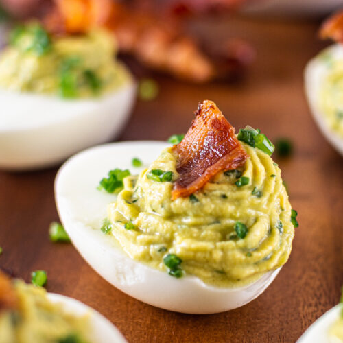Son ligeros y sabrosos, con un toque de lima y cebollín para mantener las cosas ligeras. Los huevos rellenos con aguacate son la merienda keto o baja en carbohidratos ideal. Estos huevos rellenos son un refrigerio keto delicioso que está lleno de lo mejor del aguacate.