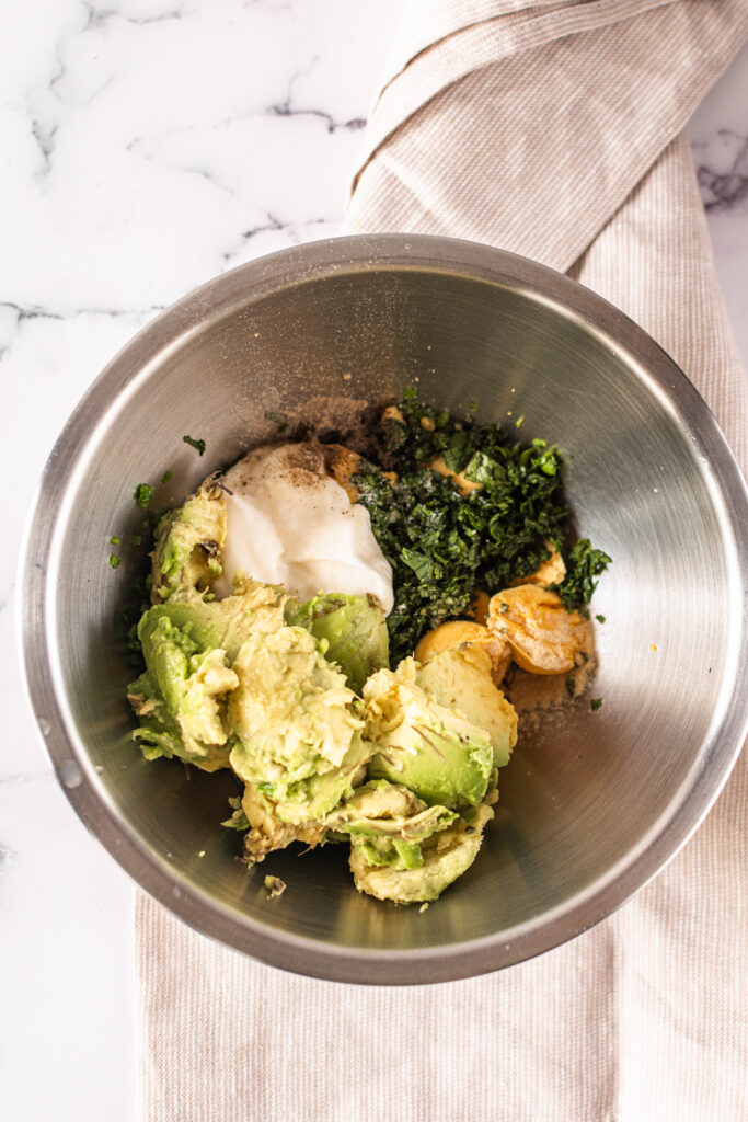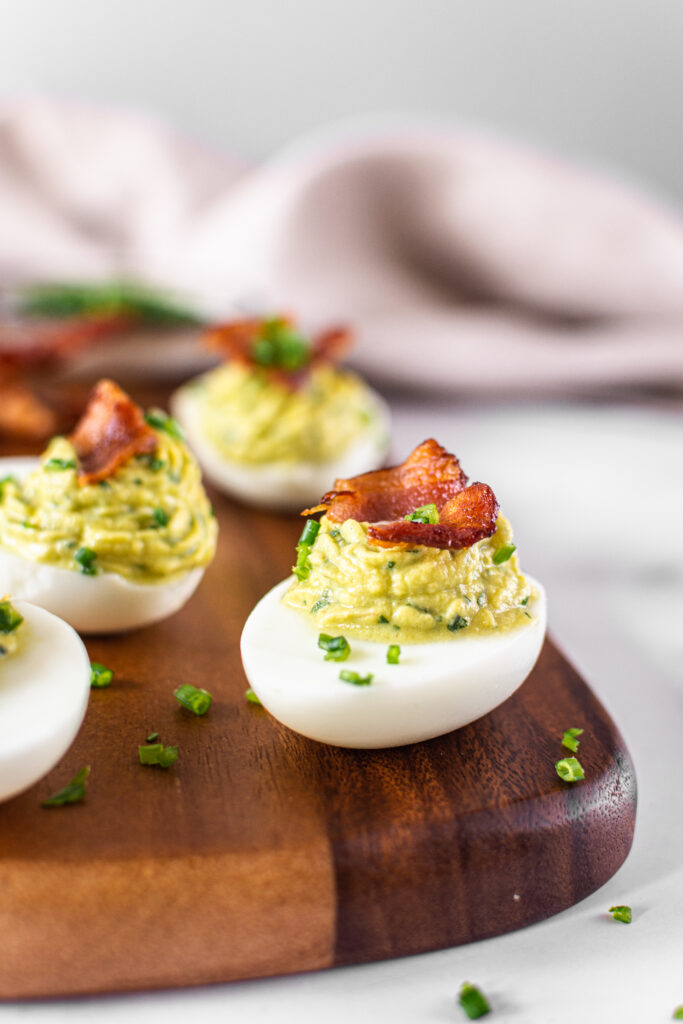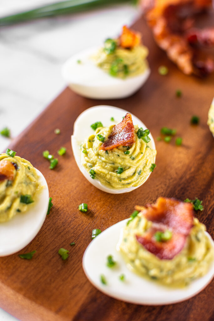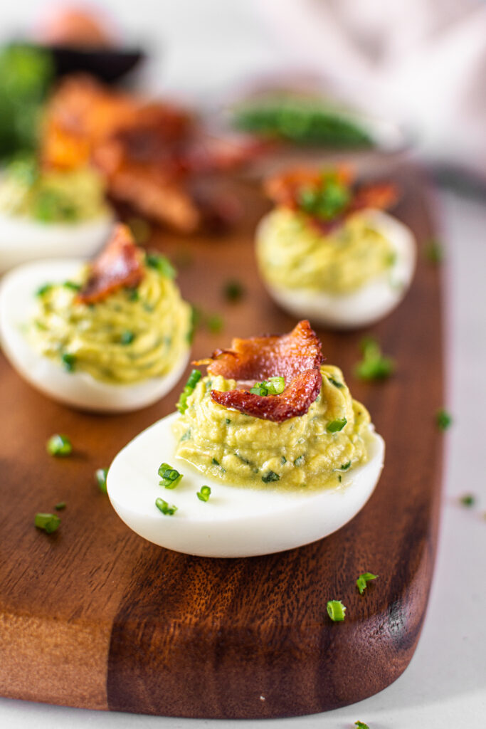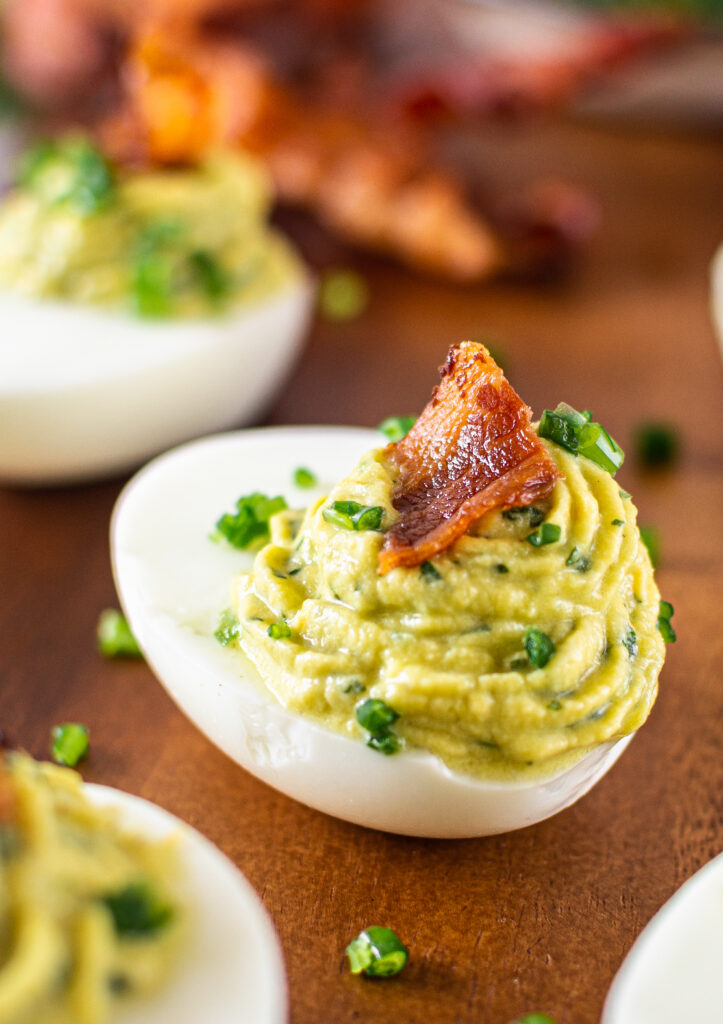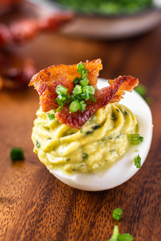 El relleno se crea con aguacate para que sea aún más saludable para las personas que no están en una dieta keto pero que les gustaría unos huevos rellenos saludables sin mayonesa.