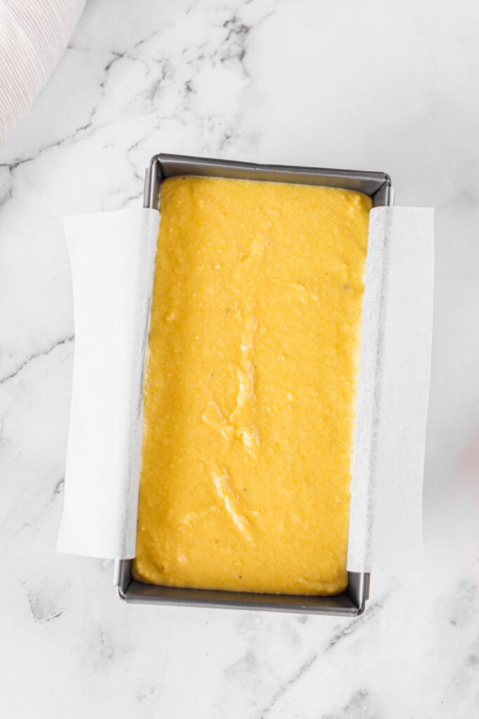 • Pour the batter onto a prepared loaf baking pan and spread it evenly.