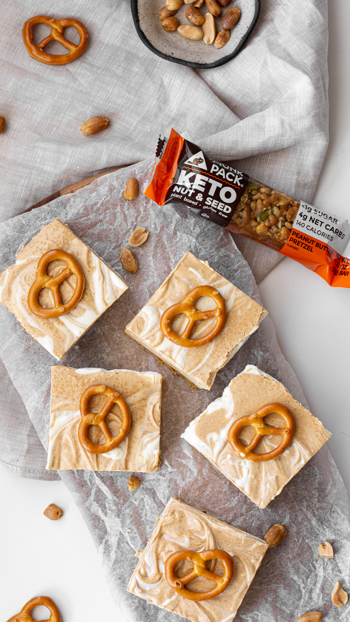 - To make the crust, finely chop the Munk Pack Peanut Butter Pretzel Keto Nut & Seed Bars. Combine them in a mixing bowl with almond flour and melted coconut oil or melted unsalted butter. Mix until fully incorporated and press down evenly on a parchment-prepared 8x8 baking sheet. Place in the refrigerator while mixing the cheesecake.