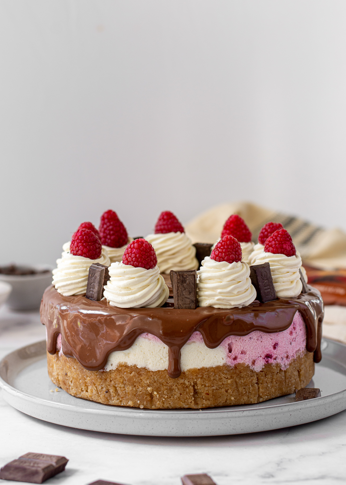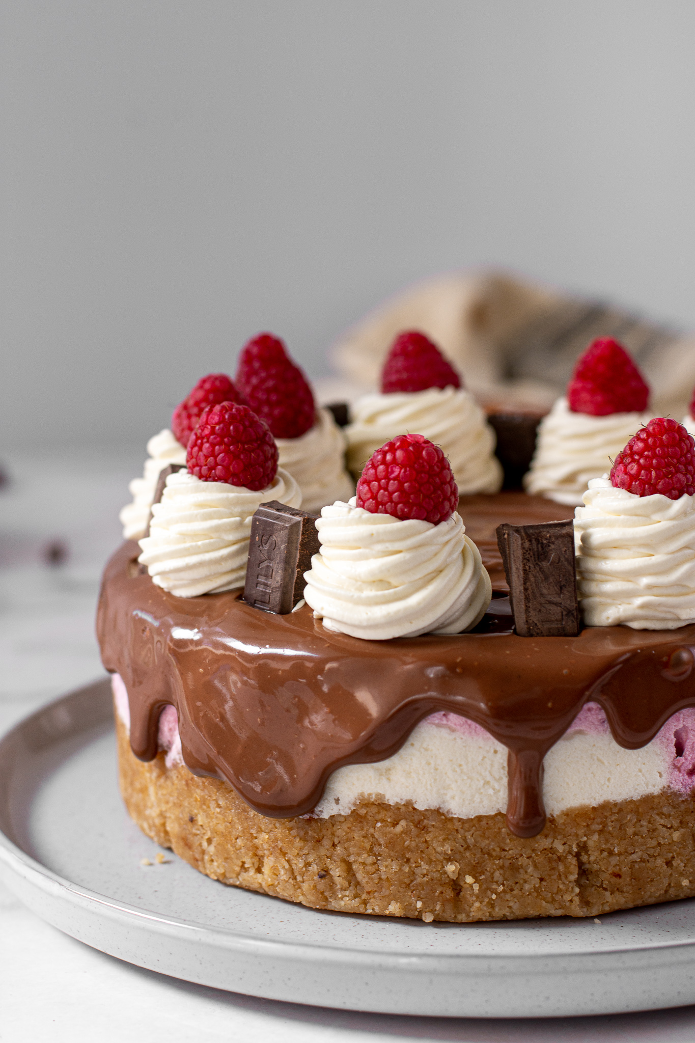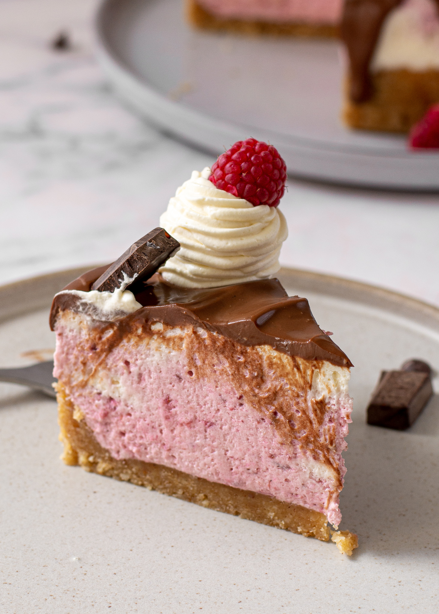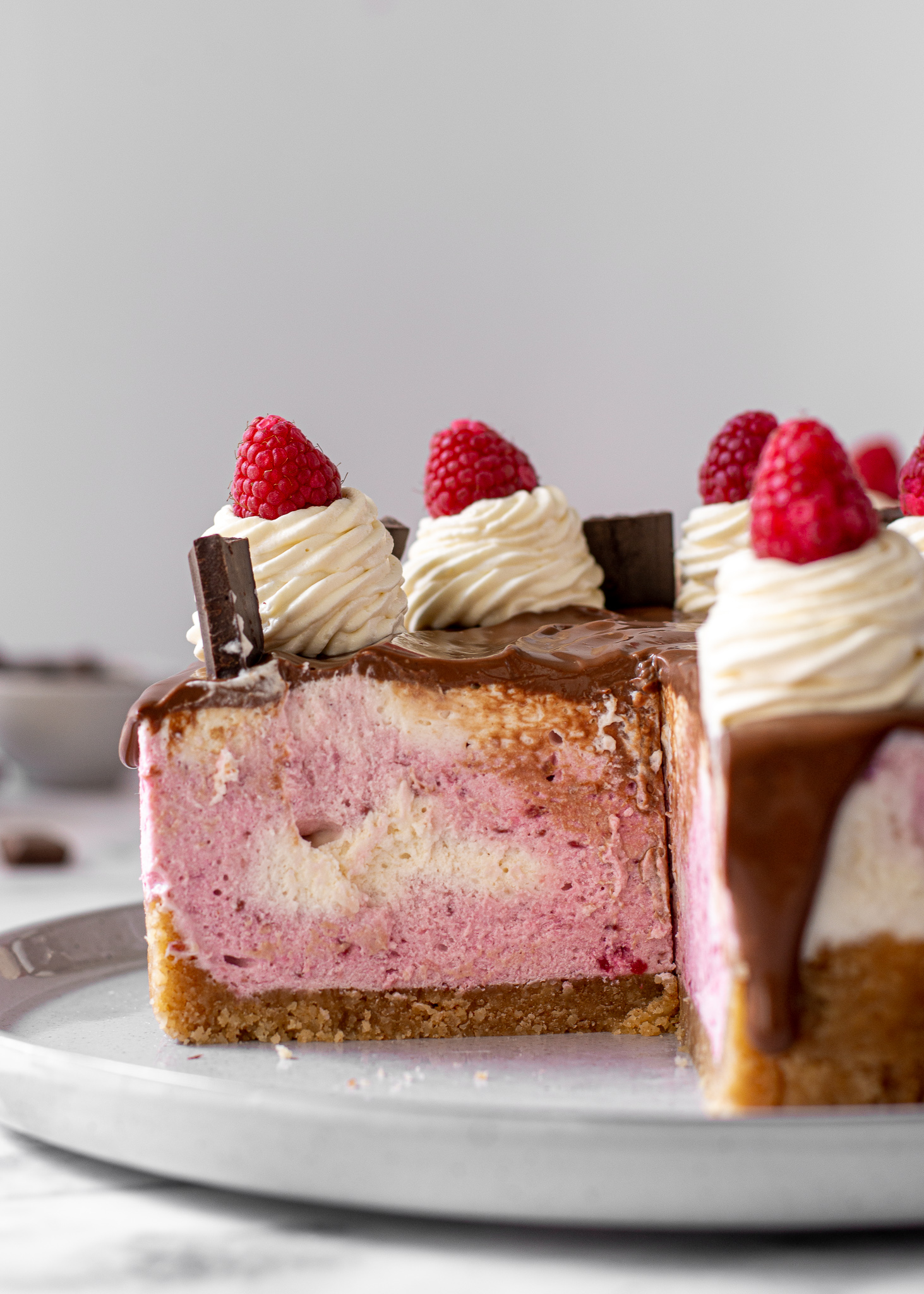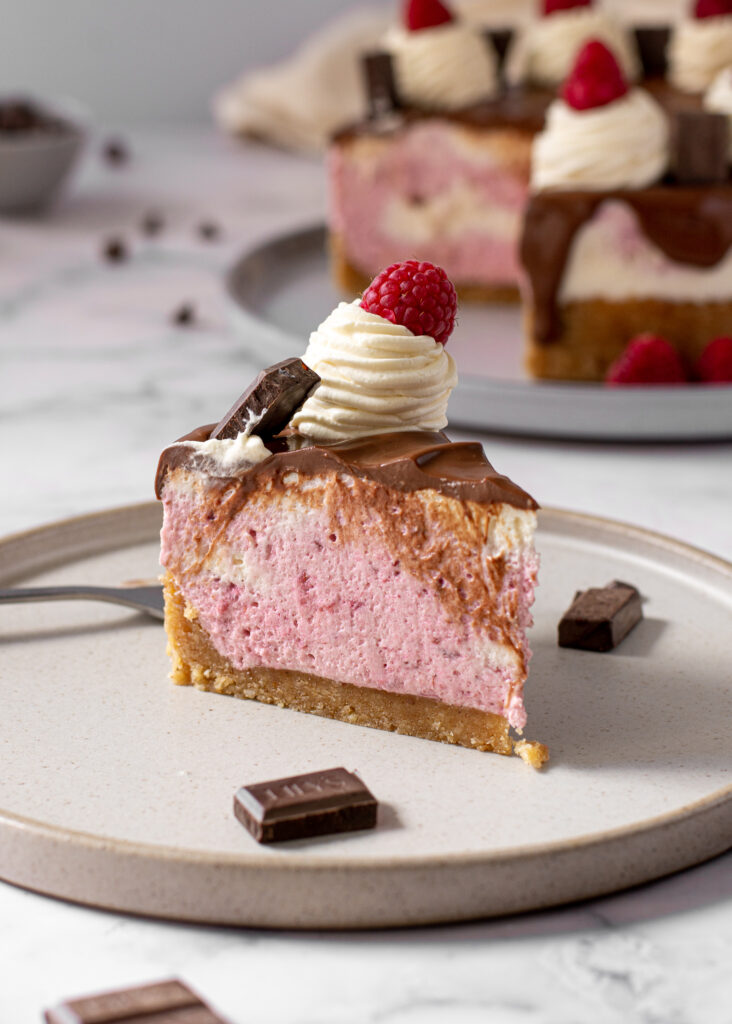 This no bake raspberry chocolate cheesecake is creamy, light, and incredibly delicious!