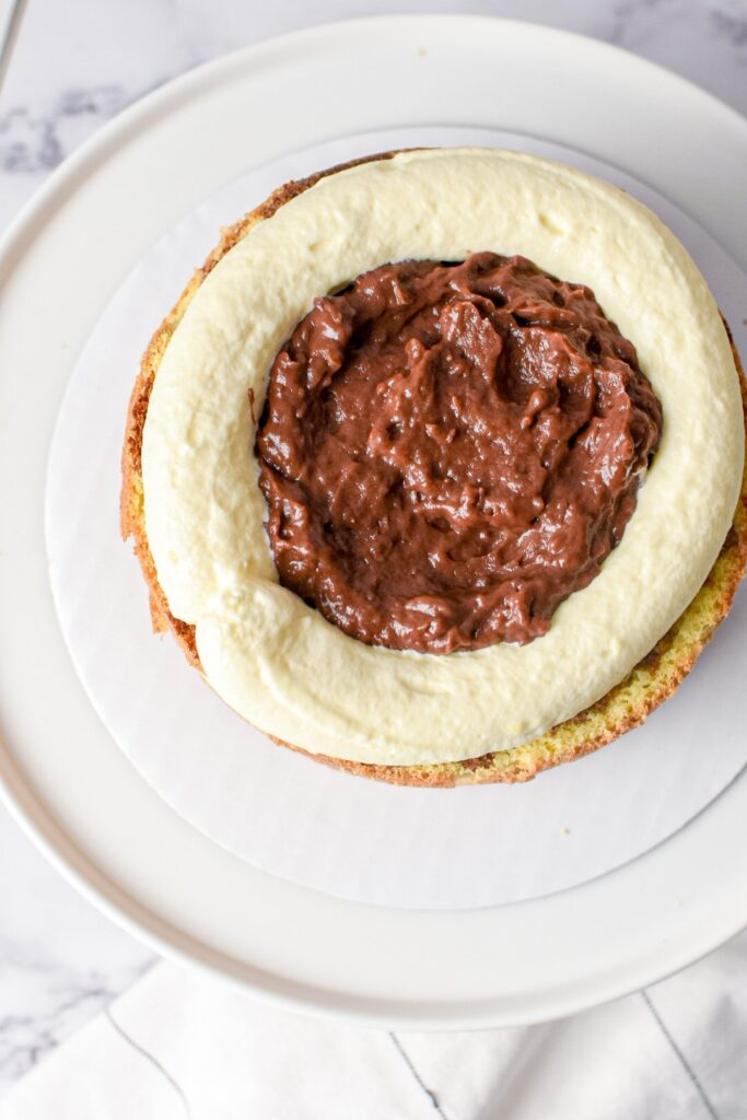 • Place the first layer on top of the small amount of mascarpone mixture and pipe a border around the top of your cake.